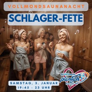 Samstag 28.02.2026 @ 19:45 – 23:00 – Stets am Samstag, der dem Vollmond am nächsten liegt, verlängern wir die Saunanacht bis 23 Uhr und machen sie zu einem besonderen Erlebnis. Gastronomie und Saunameister zaubern für Sie Dinge aus dem Hut, damit dieser Abend besonders „wohl tut“. Besondere kulinarische Schmankerl, Kostüme, Deko, neue Duftmischungen und Aufgussformen, Duftreisen, Feuereffekte, Videoinstallationen oder Diashows und mehr […]