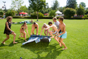 Spielstationen für Kinder Wassertisch, Fische angeln, Wassertragen, Torwand und mehr.